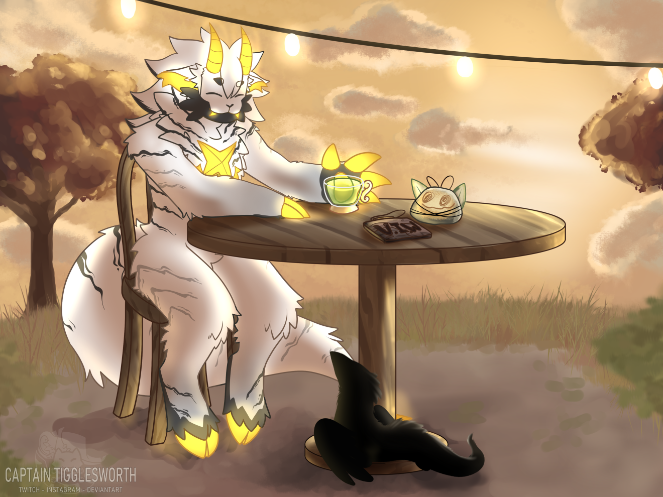 Lugh's feeling quite satisfied, though their haul is quite small. A delicious tea and a few trinkets are plenty for the Willow, and they're blissfully unaware of their unidentified visitor... who might that be, crawling about in the shadows?